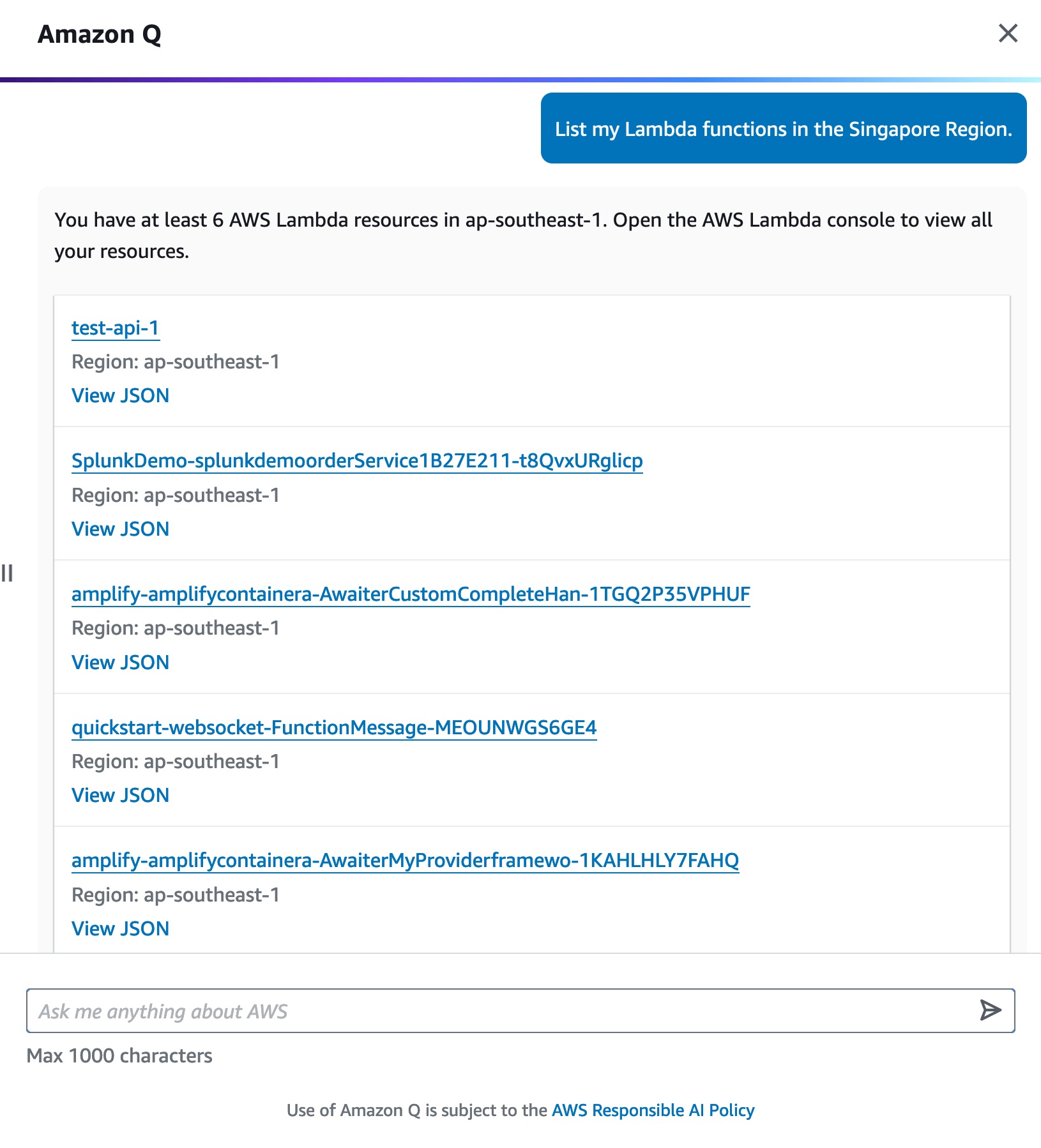 Prompt for you to try: List my Lambda functions in the Singapore Region.