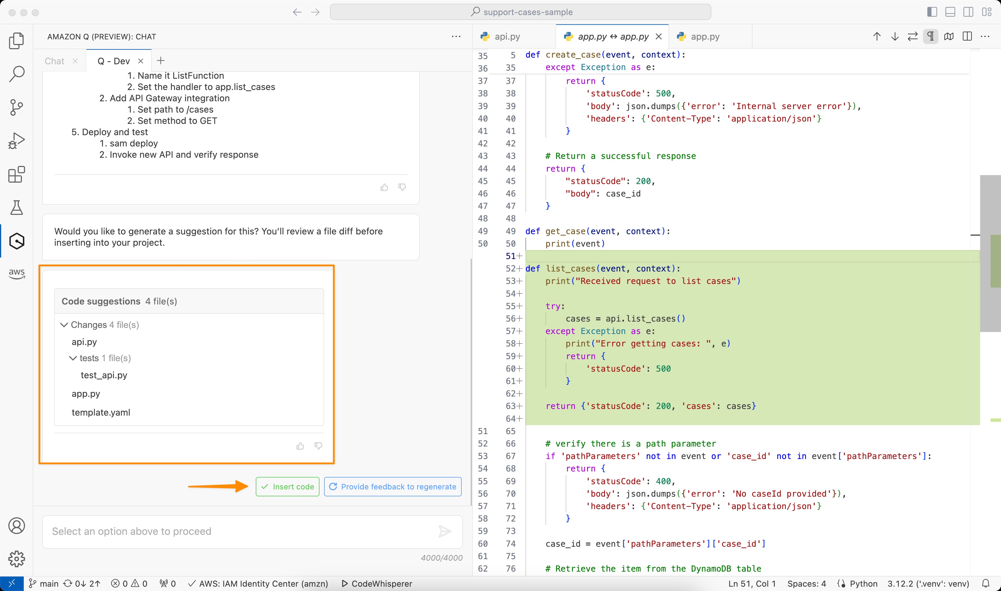 Amazon Q Developer then provides an initial plan and you can keep on iterating this plan until you’re sure mostly everything is covered. Then, you can accept the plan and select Insert code.