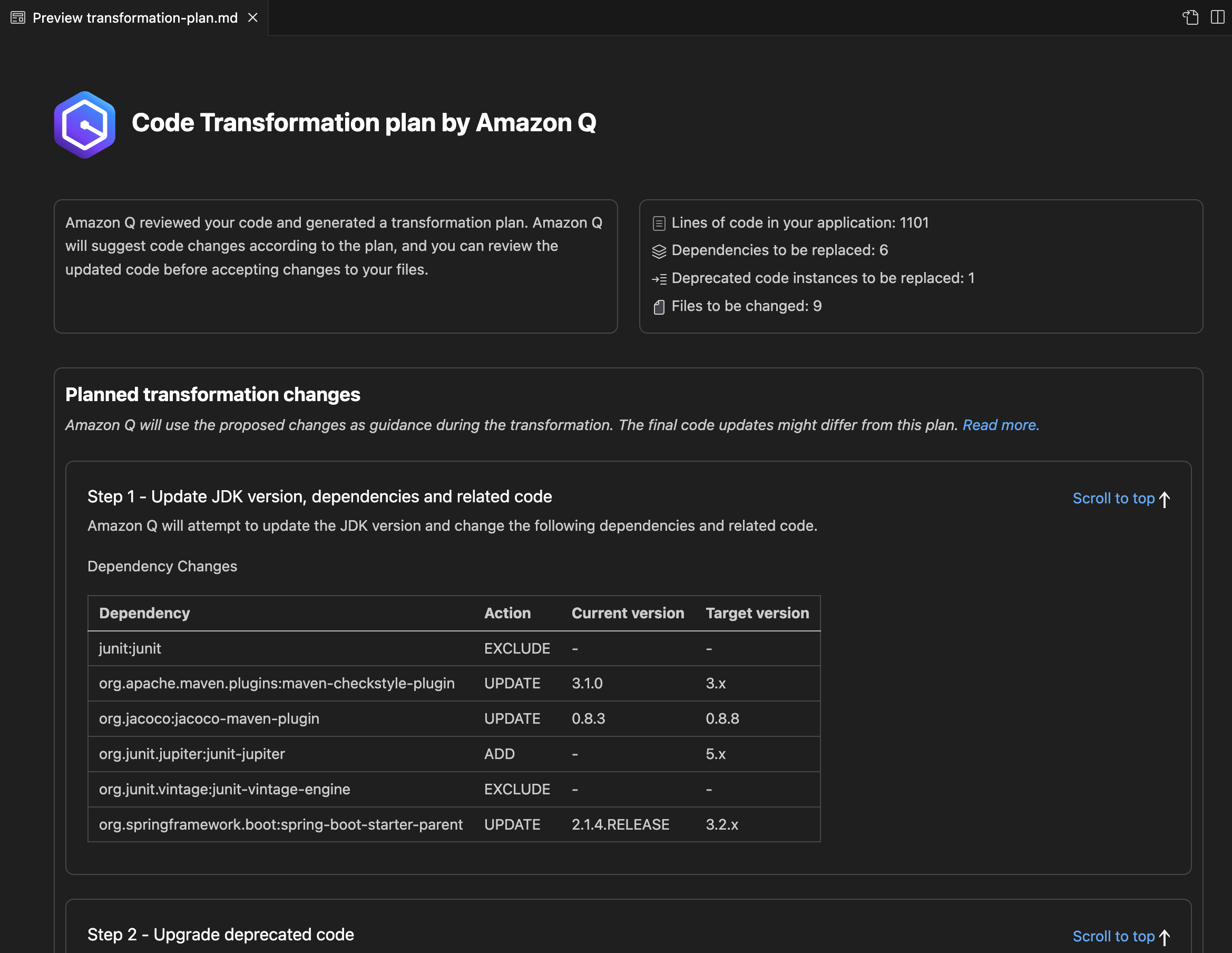 In the first step, Amazon Q identifies and provides details on the Java Development Kit (JDK) version, dependencies, and related code that needs to be updated. The dependencies upgrades now include upgrading popular frameworks to their latest major versions. For example, if you’re building with Spring Boot, it now gets upgraded to version 3 as part of the Java 17 upgrade.