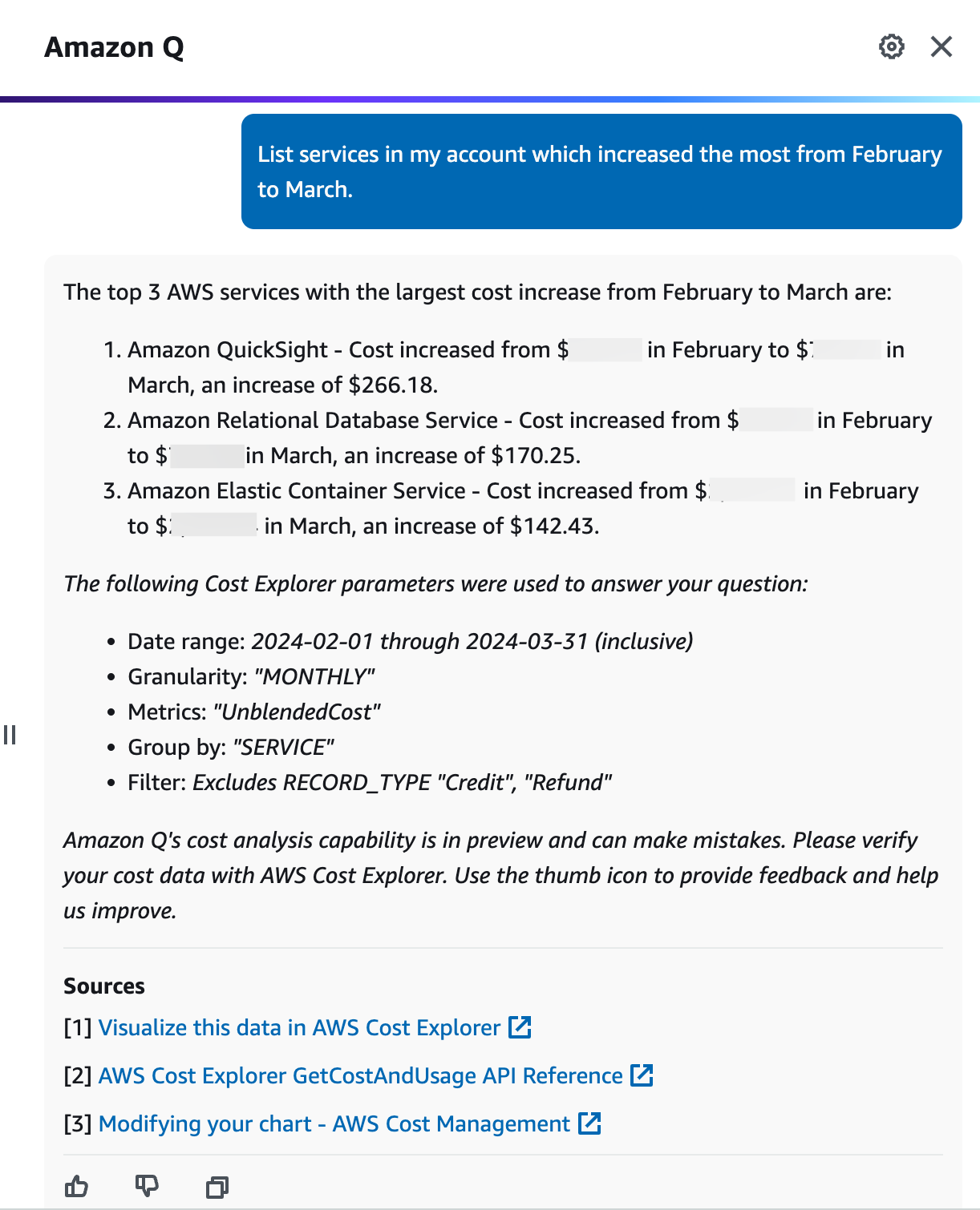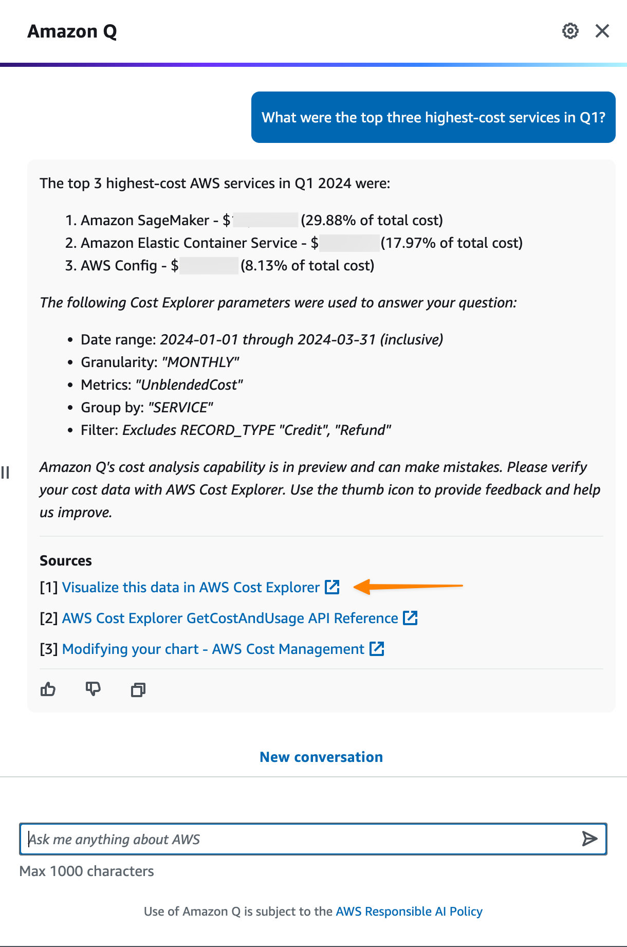 In the following example, I can ask Amazon Q Developer the top three highest-cost services in Q1 this year.