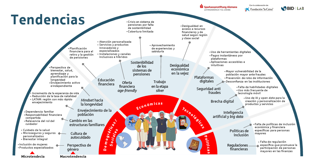 Para abordar estos desafíos, la iniciativa “Finanzas Plateadas: Inclusión Financiera de por Vida”, liderada por la Sparkassenstiftung Alemana con el apoyo de BID Lab, el Ministerio Federal de Cooperación Económica y Desarrollo (BMZ) y Fundación “la Caixa”, impulsó una serie de encuentros denominados “Horizontes Plateados”. Estos espacios de diálogo financieras, entidades reguladoras, asociaciones, startups, ONGs, organismos multilaterales, academia y expertos y expertas en el tema, con el fin de analizar tendencias, identificar retos clave y proponer acciones viables para la inclusión financiera de las personas mayores en la región. A partir de estos encuentros, se recopilaron valiosos aportes de los participantes principalmente de América Latina, cuya visión y experiencia han enriquecido este documento.