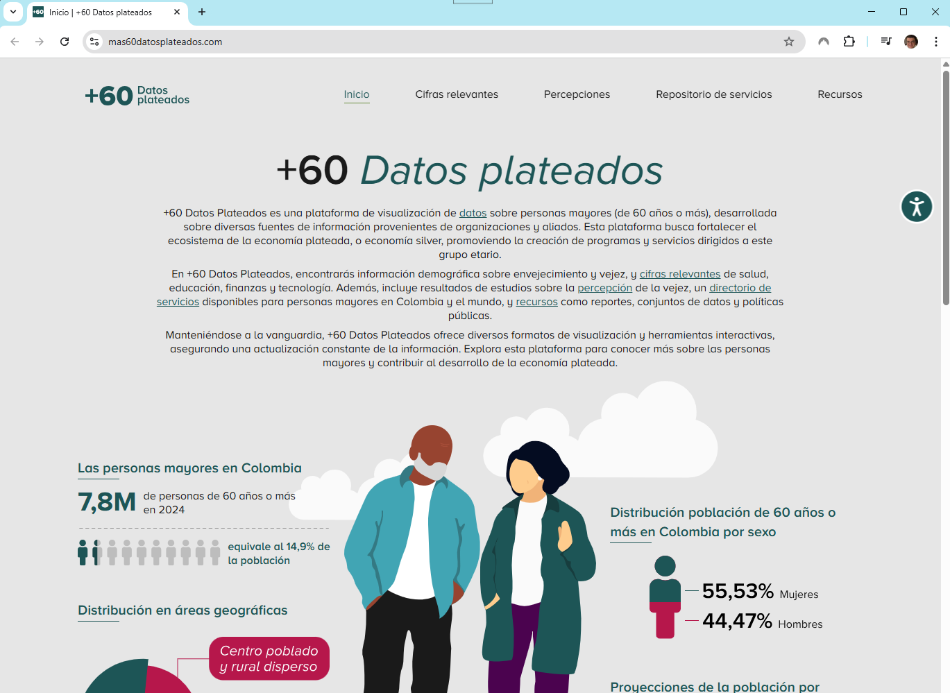 En +60 Datos Plateados, encontrarás información demográfica sobre envejecimiento y vejez, y cifras relevantes de salud, educación, finanzas y tecnología. Además, incluye resultados de estudios sobre la percepción de la vejez, un directorio de servicios disponibles para personas mayores en Colombia y el mundo, y recursos como reportes, conjuntos de datos y políticas públicas.