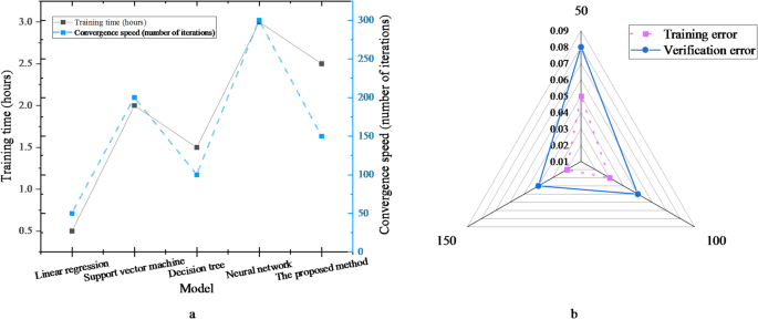 El tiempo de entrenamiento y la velocidad de convergencia son indicadores importantes para evaluar la eficiencia del modelo. Un tiempo de entrenamiento más corto y una velocidad de convergencia más rápida indican que el modelo puede alcanzar un alto rendimiento en menos tiempo, ahorrando recursos computacionales y acelerando la velocidad de la aplicación. La Figura 3 compara el tiempo de entrenamiento y el número de iteraciones de diferentes algoritmos, así como los errores de entrenamiento y validación del modelo híbrido. Los algoritmos utilizados para la comparación incluyen regresión lineal, máquina de vectores de soporte (SVM), modelo de árbol de decisión y red neuronal.