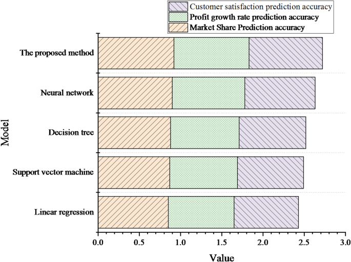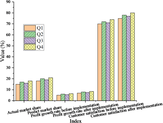 La Figura 5 revela que la cuota de mercado prevista por el modelo se alinea con los valores reales. Tras implementar las recomendaciones estratégicas sugeridas por el modelo híbrido, la cuota de mercado de la empresa aumenta significativamente, lo que indica la sólida capacidad predictiva y de orientación del modelo en términos de cuota de mercado. La tasa de crecimiento de las ganancias también mejora tras aplicar las sugerencias del modelo híbrido, lo que confirma aún más su eficacia en la toma de decisiones empresariales prácticas. La satisfacción del cliente presenta un aumento notable, alcanzando un máximo del 80 % en el cuarto trimestre, lo que demuestra la eficacia del modelo para optimizar la experiencia del cliente.