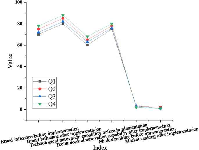 La mejora de la competitividad corporativa es un indicador crucial para evaluar los efectos prácticos del modelo. La eficacia de la aplicación del modelo híbrido se evalúa comparando los indicadores de competitividad de la empresa, como la posición en el mercado (ranking), la influencia de la marca y la capacidad de innovación tecnológica, en diferentes períodos. La Figura 6 presenta los resultados.