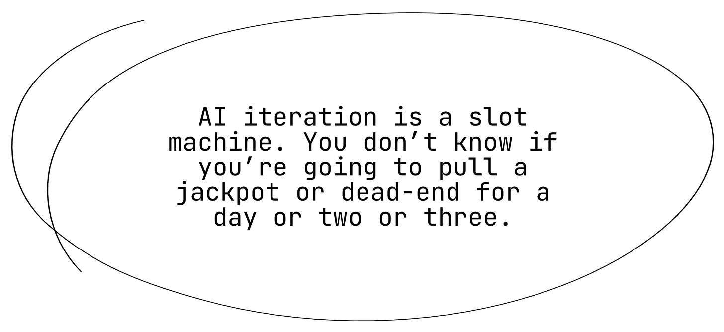 El problema es que no se puede planificar la iteración de la IA. Es una máquina tragamonedas. No sabes si vas a sacar un premio gordo o ver con horror cómo terminas en un callejón sin salida durante un día o dos o tres en el mismo bucle roto.
