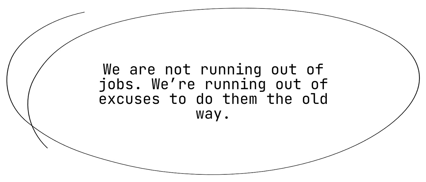 No nos estamos quedando sin trabajo. Nos estamos quedando sin excusas para hacerlos a la antigua. El resto es una elección. Abraza el futuro y no huyas de él. Llegará de todos modos, y será hermoso para cualquiera que lo reciba con los brazos abiertos.