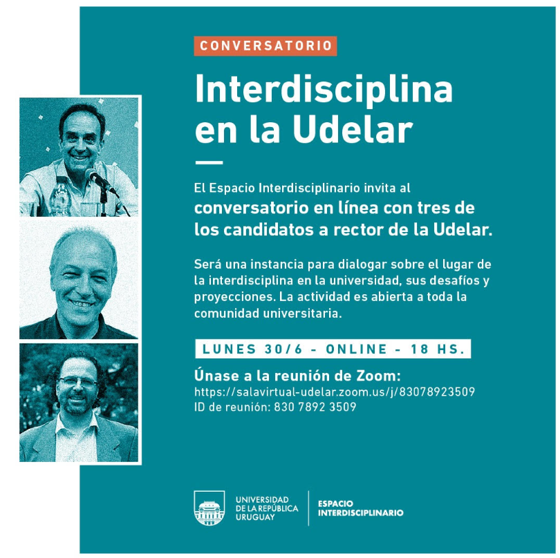 El Espacio Interdisciplinario invita a la comunidad universitaria al conversatorio en línea “Interdisciplina en la Udelar”, con la participación de tres candidatos a rector de la Universidad de la República.La actividad se realizará el lunes 30 de junio a las 18 h, vía Zoom, y será una oportunidad para reflexionar sobre el lugar de la interdisciplina en la universidad, sus desafíos y proyecciones.